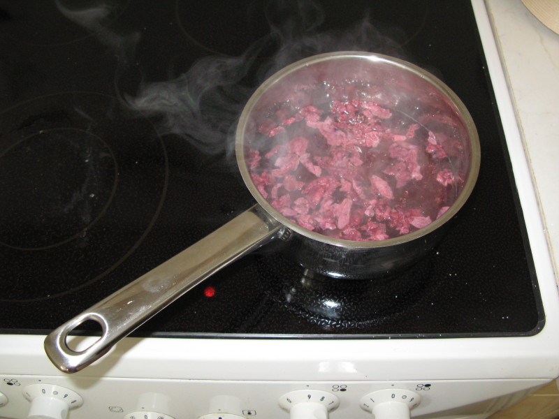 Sestavine zmešaš in segrevaš do vretja. Šele takrat se bo sladkorna raztopina (skoraj v hipu) močno obarvala. Pokuhaš še nekaj minut , ugasneš štedilnik in še vroče precediš v kozarec. Dobro zapreš, obrneš za nekaj minut na glavo in barvilni sirup je pripravljen.
