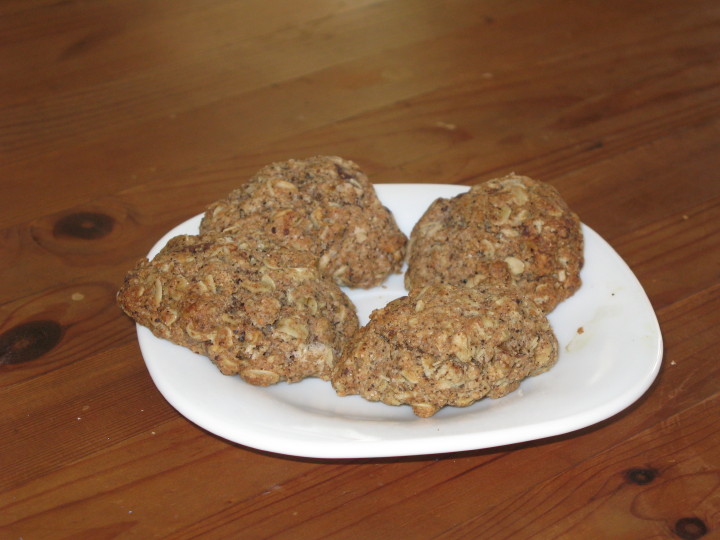 Priprava: Najprej zmešamo jajce, maslo, sladkor, vanilijev sladkor, cimet. Nato dodamo moko in pecilni prašek in na koncu še kosmiče, čokolado in orehe. Testo mora vsaj 1/2 ure počivati v hladilniku. Na pekač nadevamo kupčke testa in pečemo pri temperaturi 180°C 12-14 minut.