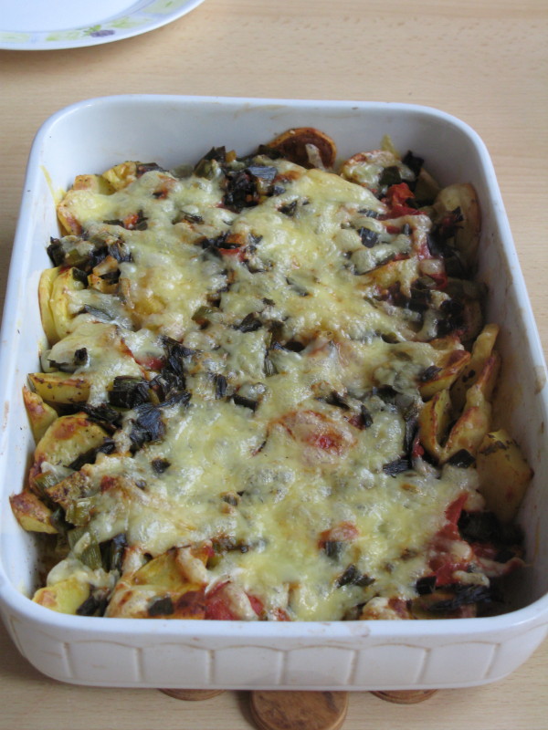 Priprava: Krompir olupimo in zrežemo na kolobarje. Naložimo ga v pekač, naoljimo z olivnim oljem in posujemo z origanom. Dobro ga premešamo in pečemo na 200°C 20 minut. Vmes, ko se krompir peče, pripravimo omako, in sicer tako, da najprej grobo zrežemo paradižnik. Prepražimo ga na olivnem olju. Nato operemo divji luk in ga zrežemo na 1-2 cm velike kose. Dodamo jih k paradižniku in solimo. Oboje skupaj pražimo približno 15 minut, vmes po potrebi (da se ne prismodi) zalijemo z vodo. Ko je omaka končana, vzamemo krompir iz pečice, naložimo nanj omako iz divjega luka, nato pa čez naribamo še 150 g sira. Vse skupaj prelijemo s petimi žlicami sladke smetane in pečemo še 15-20 minut.