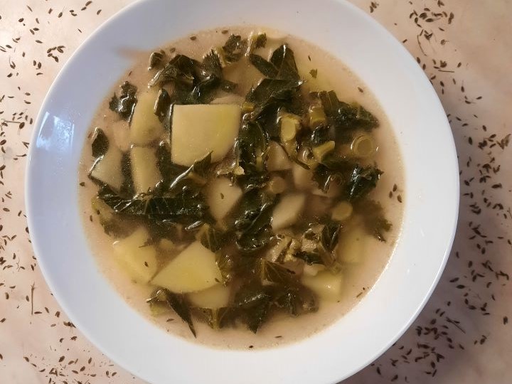 Priprava: Krompir zrežemo na koščke, dodamo kumino in grobo zrezane liste listnatega ohrovta. Zalijemo z vodo (cca 1,5 litra). Kuhamo do mehkega. Na koncu dodamo še zrezan česen, sol in olivno olje.