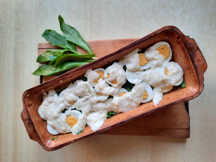 Umite krompirje skuhamo v lupini. Cca 20 minut pred koncem kuhanja dodamo v vodo h krompirjem še umita jajca. Med kuhanjem pregledamo in splaknemo čemaž. Damo ga na cedilo za testenine, šopek pa ga damo na stran. Ko so krompir in jajca kuhani, vrelo vodo odlijemo preko cedila, v katerem je čemaž. Poparjen čemaž zrežemo na cca 1 cm široke trakove. V pekač izmenično naložimo plast vročega krompirja in plast zrezanega čemaža. Vsako plast nekoliko potlačimo, da zagotovimo trdnost zloženke, in solimo. Plasti s čemažem nakapamo z olivnim ali bučnim oljem (lahko izmenično). Na zadnjo plast posujemo svež drobno zrezan čemaž, ki smo ga na začetku dali na stran. Na vrh naložimo na kolobarje razrezana kuhana in olupljena jajca. Vse skupaj prelijem z bešamelom, ki smo ga pripravili iz mleka, sladke smetane,4-ih ščepcev soli in dveh do treh žličk moke. Bešamel se naredi tako, da mleko sol in sladko smetano zavremo, na koncu pa noter vmešamo še moko, ki smo jo zmešali v nekaj žličkah hladne vode. Moko se zmeša posebej, da se ne naredijo grudice iz moke.